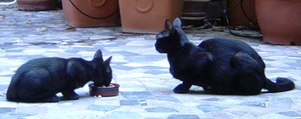 Depuis son arrivée, la maison est plus qu'animée ; de temps en temps, on entend des cavalcades, les deux énergumènes se poursuivant, les tapis valdinguent… Ils se planquent en dandinant le derrière puis se sautent dessus ; dix minutes après, je les retrouvent dans le lit de Venom, le grand ayant posé une patte protectrice sur les épaules de la petite et semblant l'aimer très fort. C'est un perpétuel jeu entre rivalité et amour.